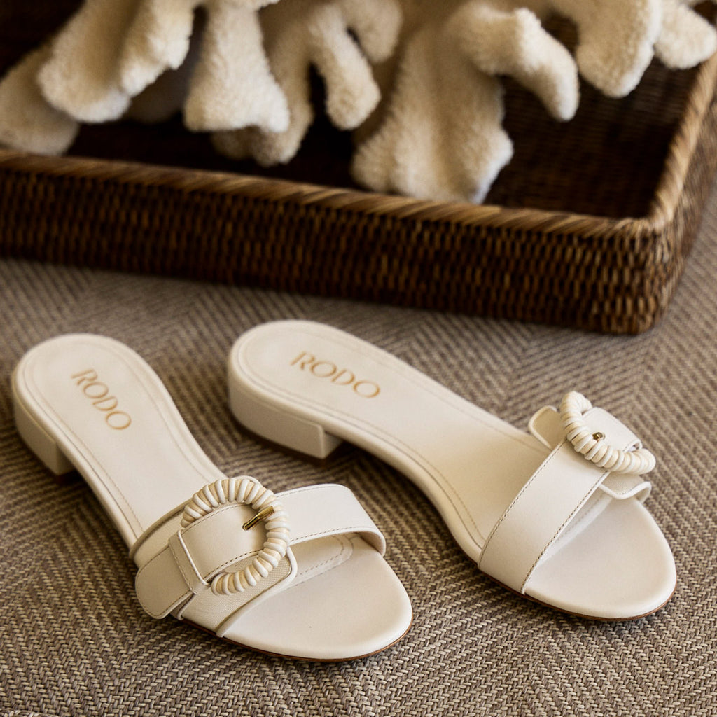Rodo’s Opal Flat Slide enhances an everyday essential with elevated detailing. Crafted in Italy, this refined style features a wicker-wrapped buckle, a mesh panel insert, a backless silhouette and a subtle block heel base.