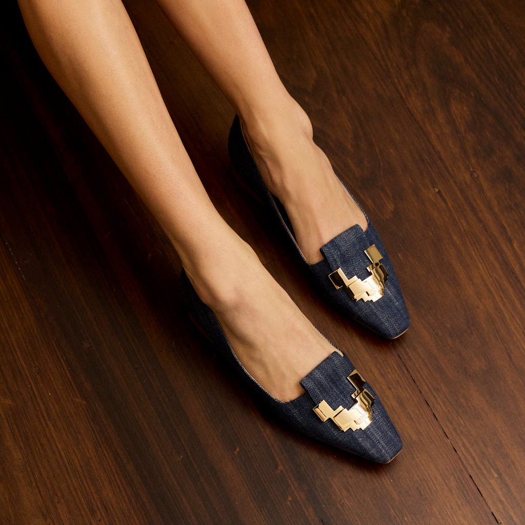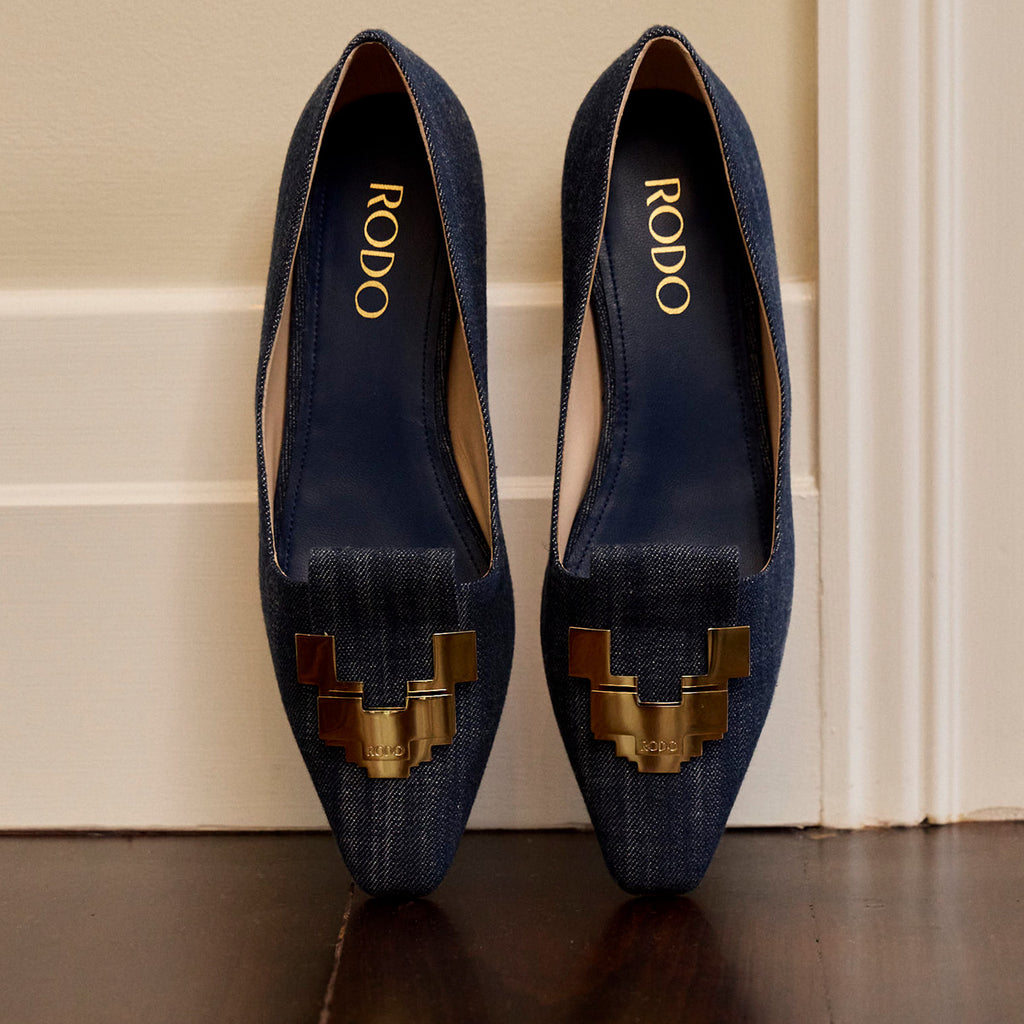 Denim and demure details give Rodo’s Pollie Flats both wearability and covetability. Crafted in Italy with a dark denim upper, this style features a tapered square toe, a signature metal brooch engraved with the Rodo logo, and a comfortable stacked flat block heel base.