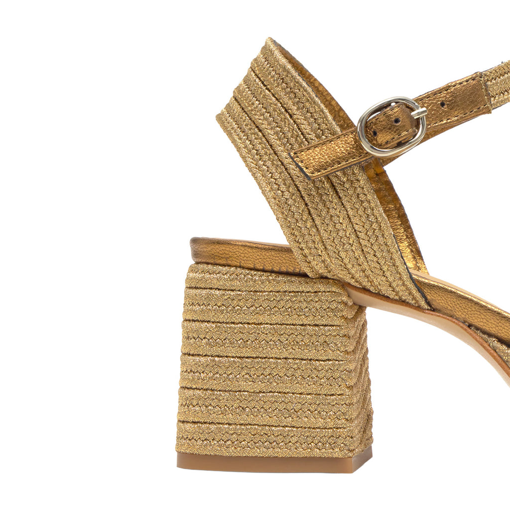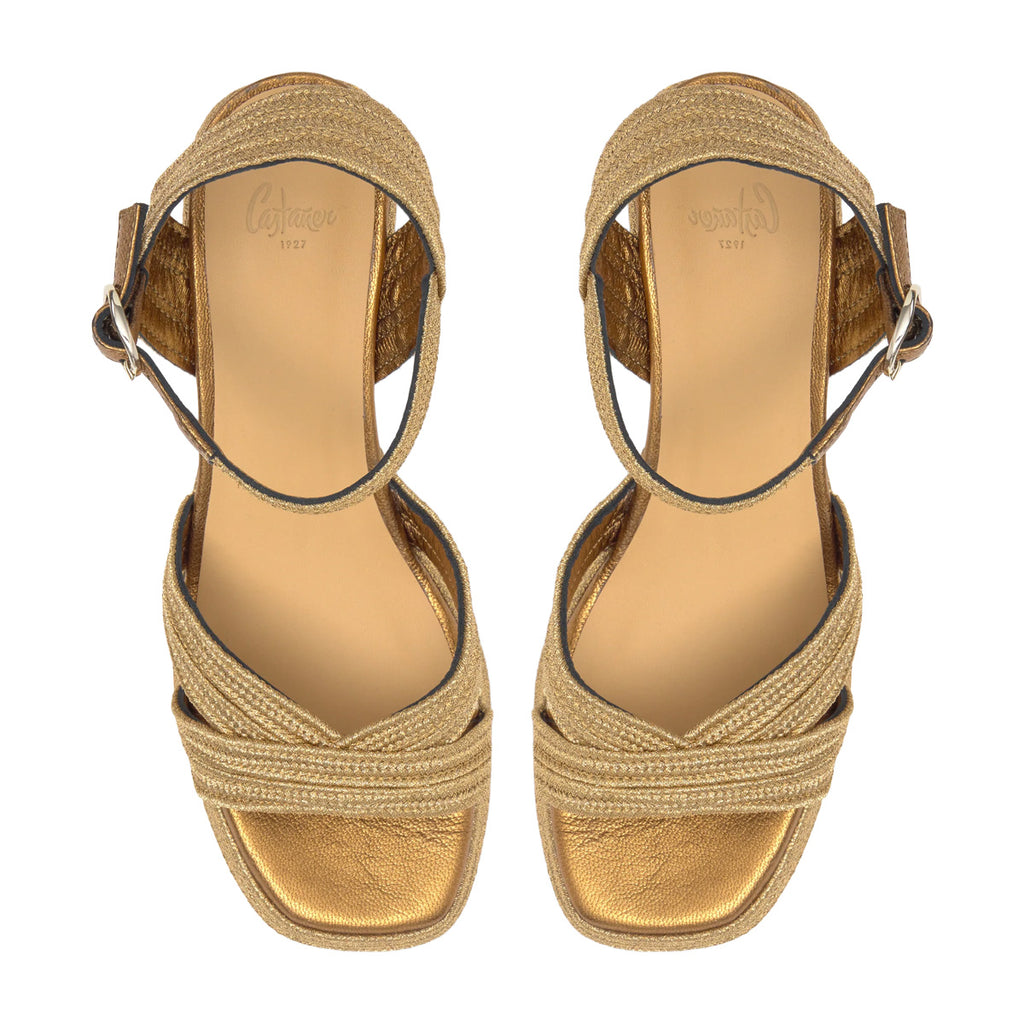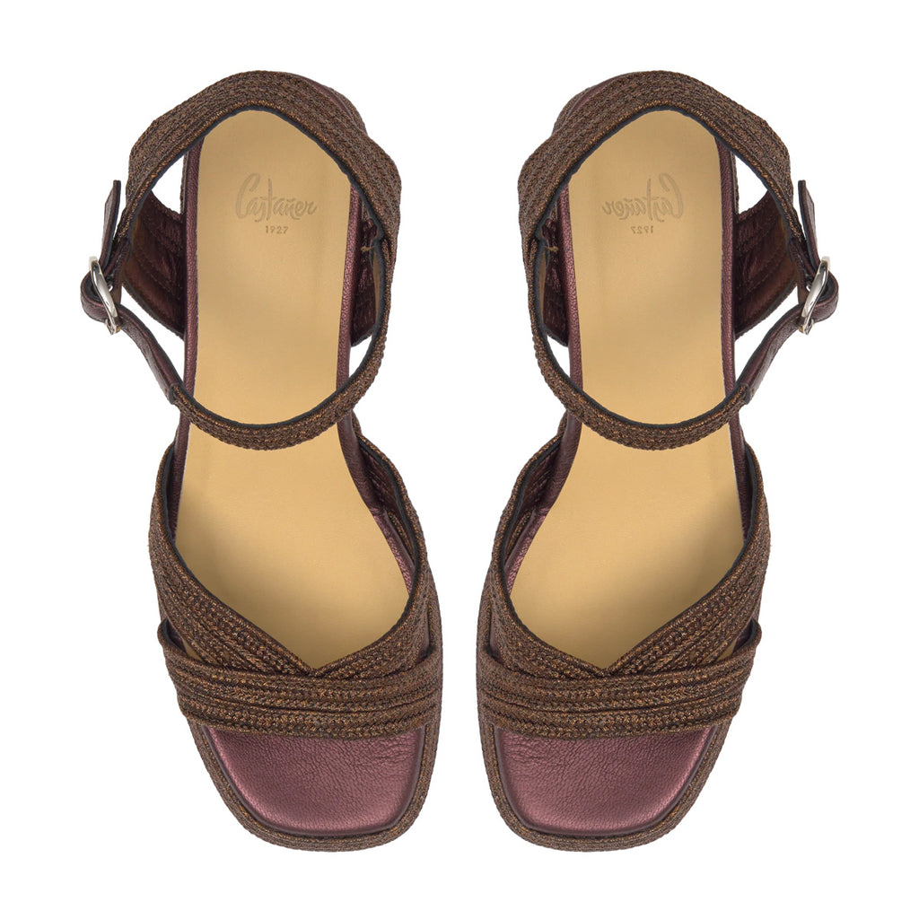 Transition from day to night in Castañer’s Vallita Platform Sandals, a new mid-heel take on one of the brand’s most iconic styles. Handcrafted in Spain, this platform sandal features hand-woven metallic braiding, an open square toe, an adjustable buckle ankle strap and a block heel base.