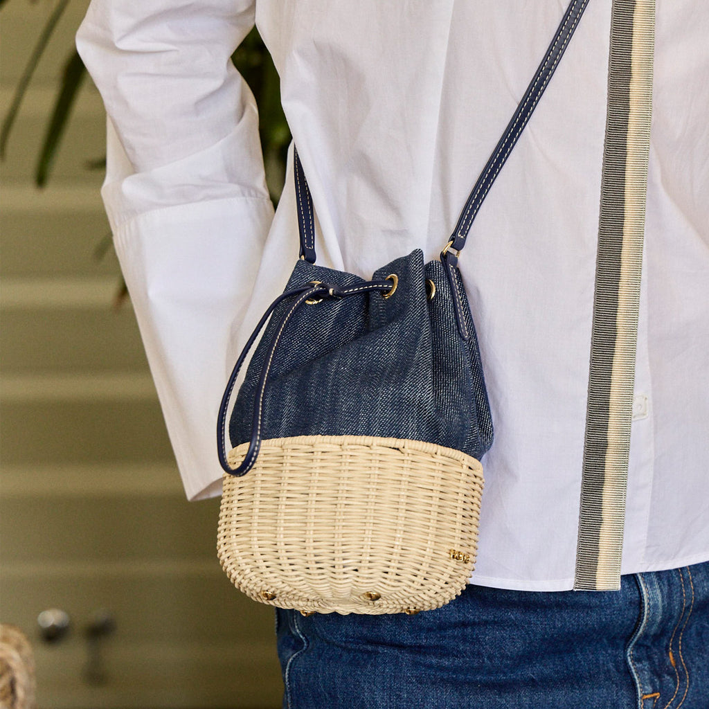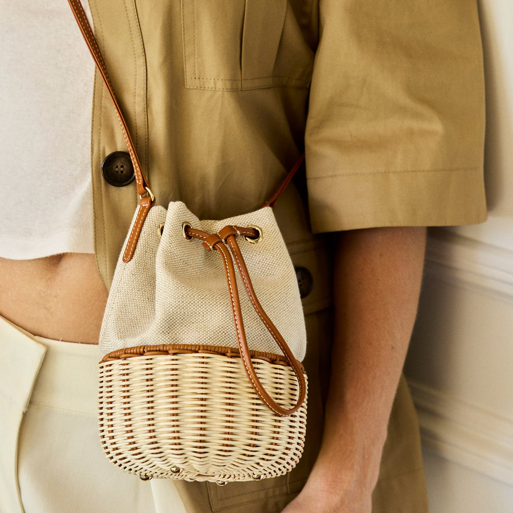 A textured wicker base meets a relaxed fabric panel for a charming look in Rodo’s Adria Bucket Bag. Handmade in Italy, this compact bucket silhouette features handwoven wicker, a leather shoulder strap, a leather drawstring closure and contrast stitching details.