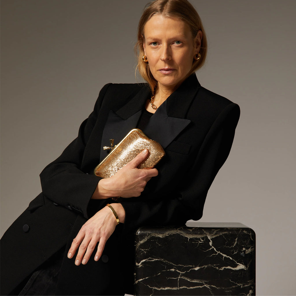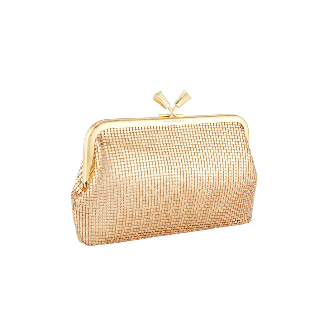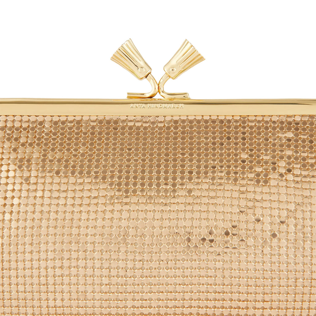 The glamour of gold metal mesh in Anya Hindmarch’s Maud Metal Mesh Clutch offers an elevated finishing touch for weddings, celebrations and nights out. Designed with a structured frame, this piece is detailed with the brand’s signature tassel clasp, a soft suede lining and an optional chain strap.