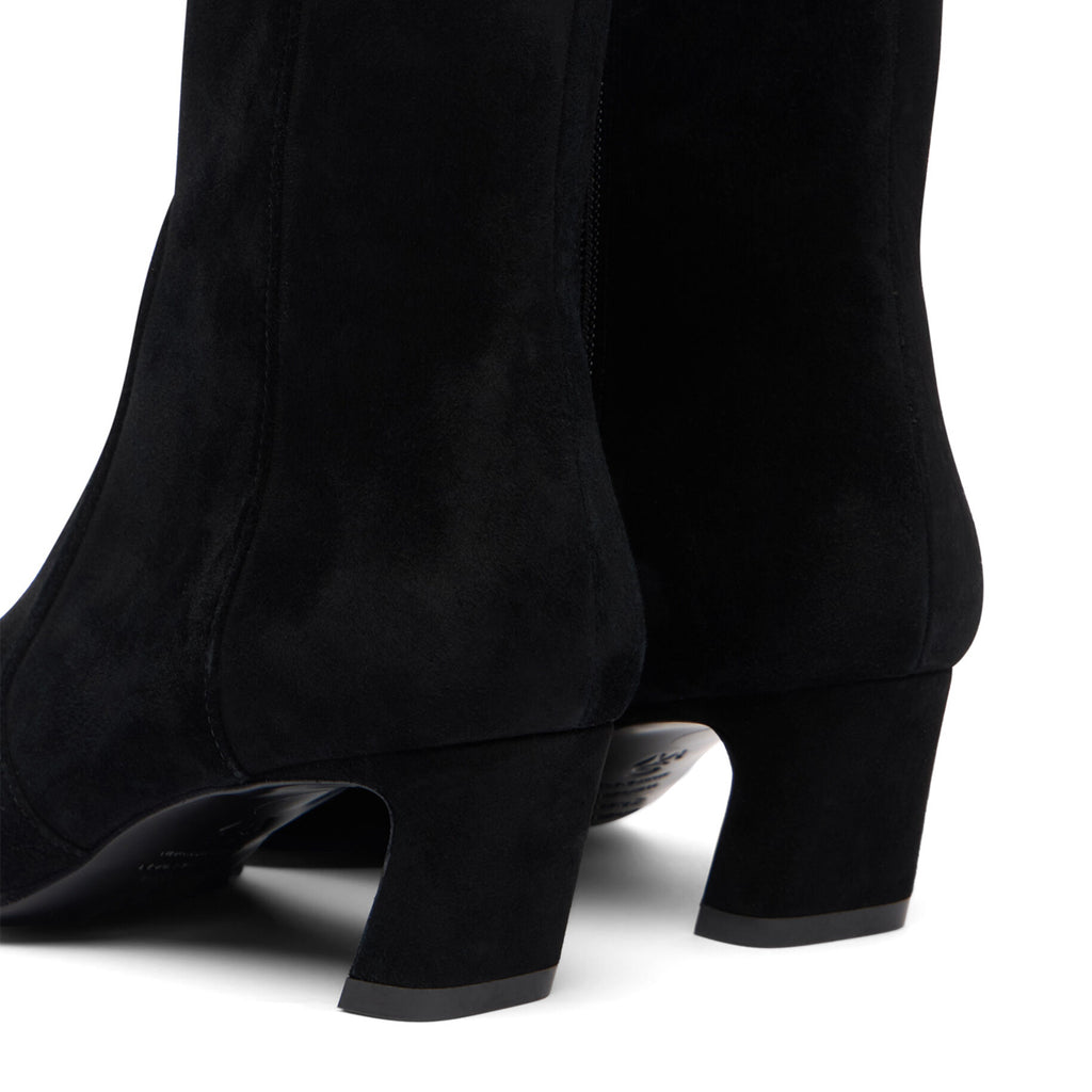 Embrace elongated-toe elegance with Stuart Weitzman's Stassi Boot. Crafted in Spain from soft black suede, this ankle boot features a tapered square toe, a side-zip closure, and a subtly slanted heel base.