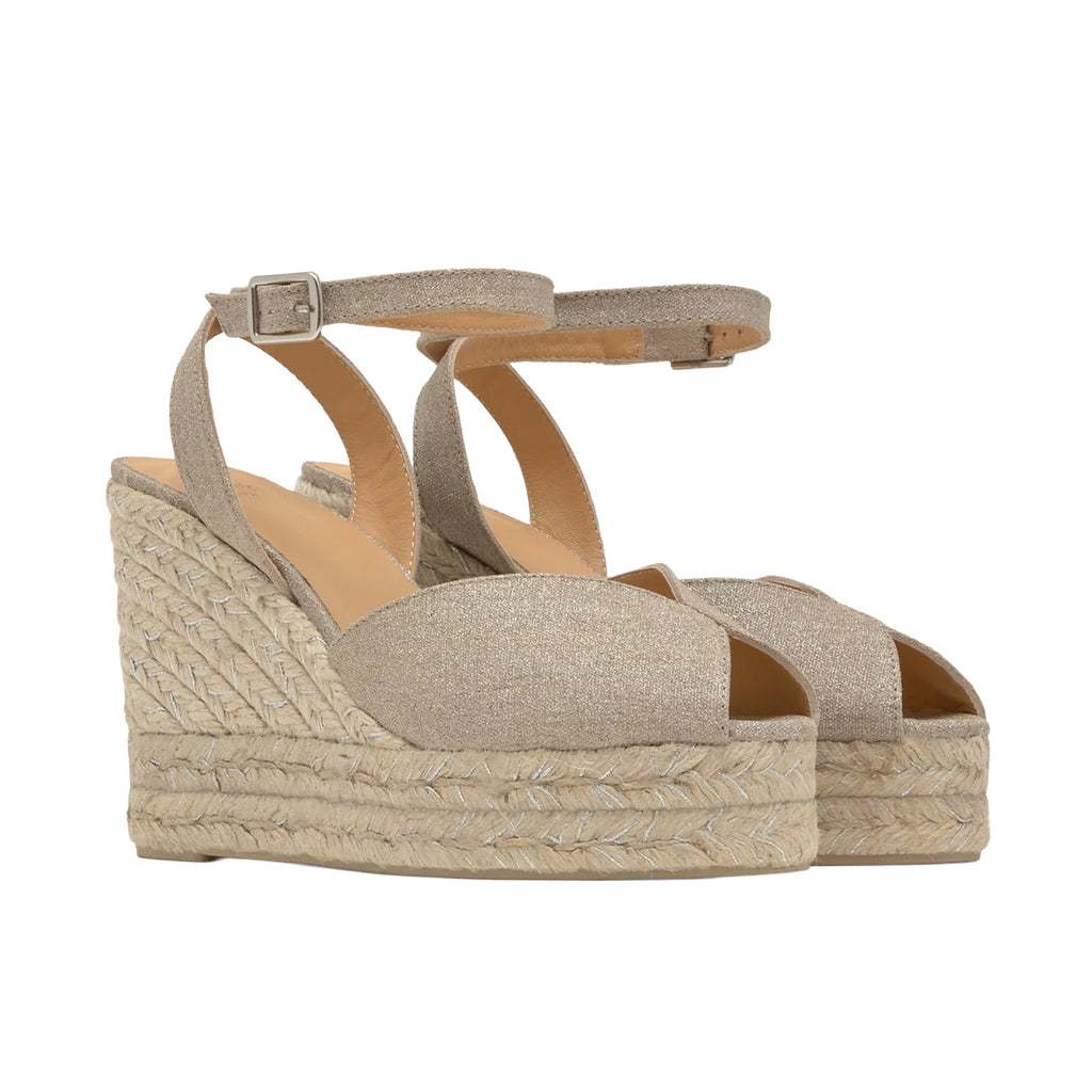 Add some shimmer to your summer with the Blossom wedges by Castañer. Expertly crafted in Spain from metallic linen, this style features a V-cut vamp, a two-tone jute espadrille heel and an adjustable ankle strap.
