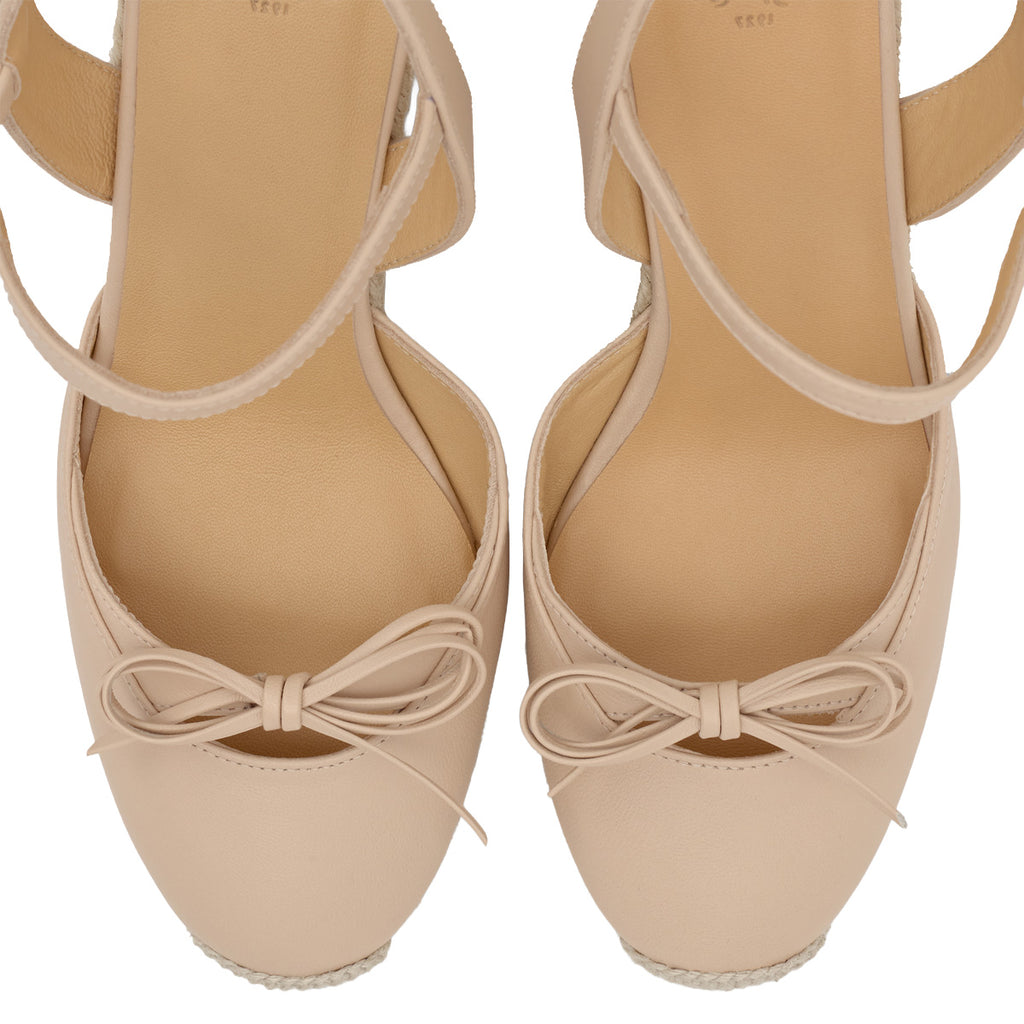 A summer staple, the Cyra wedge from Castañer is the ideal mix of neutral and feminine. Crafted in Spain from soft nude leather, this espadrille design features delicate bow details, a braided jute wedge and an adjustable buckle ankle strap.