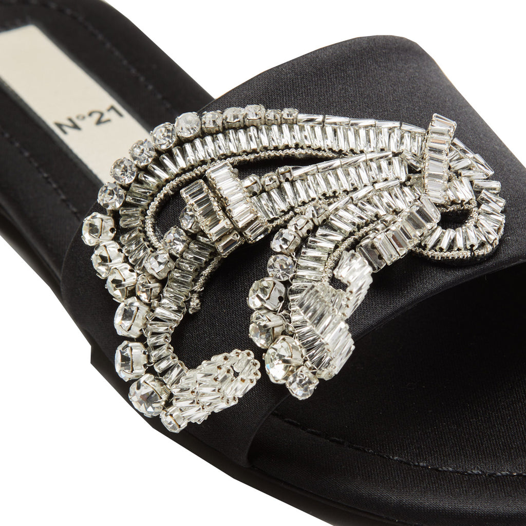 A striking crystal-embellished motif across the front strap adds statement sparkle to the minimalist design of N°21’s Embellished Satin Flat Slide. Crafted in Italy, this single-band style features a black satin upper, intricate crystal-appliqué detailing, and a backless slip-on silhouette.