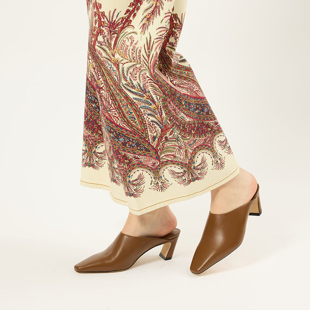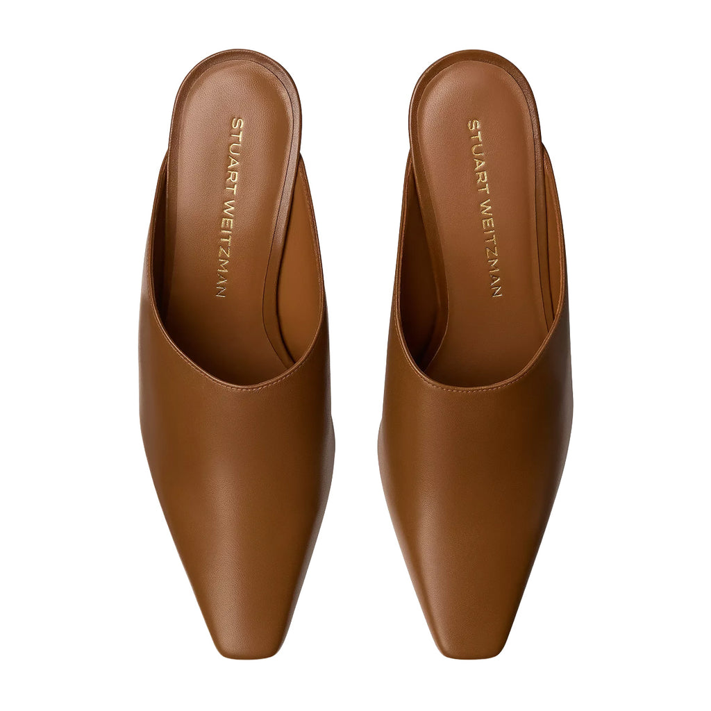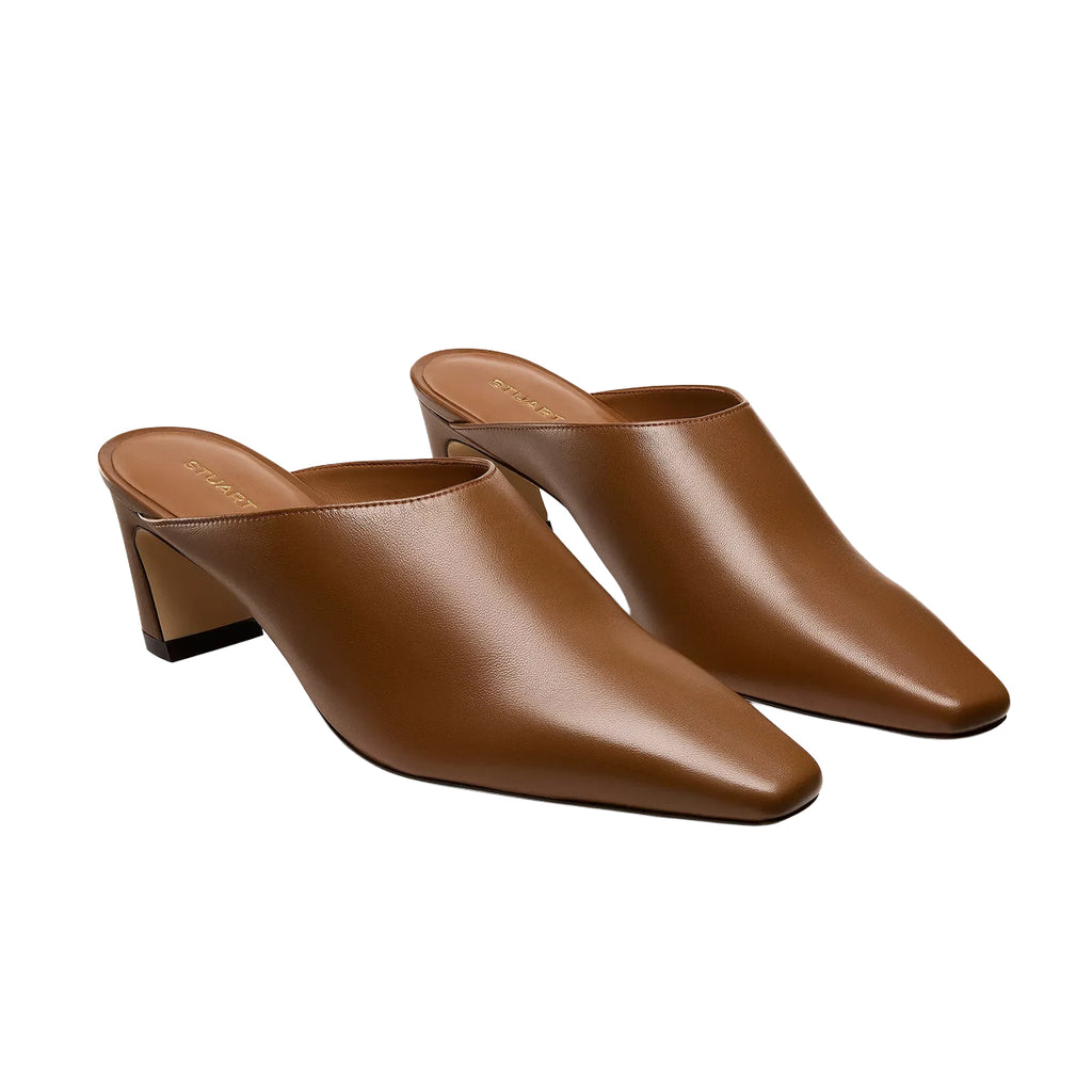 Stuart Weitzman delivers modern minimalist perfection in the Stassi Mule. Handcrafted in Spain from smooth almond-toned leather, this style features a squared-off pointed toe, an angled mid-heel base and a backless silhouette.